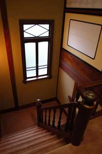 こちらは離れの2階部分。8畳+8畳の続き間で、それとは別に小上がりのベッドルームもあるのです。いったいどれだけ広ければ気が済むんだと思いま す。でもこの棟の味は広さではないんです。欄間をはじめとした細部の装飾がとっても丁寧で、昔の人の粋が感じられます。