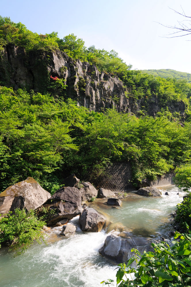 蔵王のお釜へ向かう山道を右にそれて奥へ進むと、そこはまさに秘境。神が彫った彫刻かと思うような神々しいなこの壁が現われる。峩々温泉はこの対岸にある一軒宿。