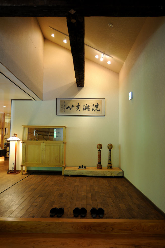 すっきりと洗練された宿泊棟の玄関。日帰りのお客さんとは棟が別れているので、ずいぶんと静だ。