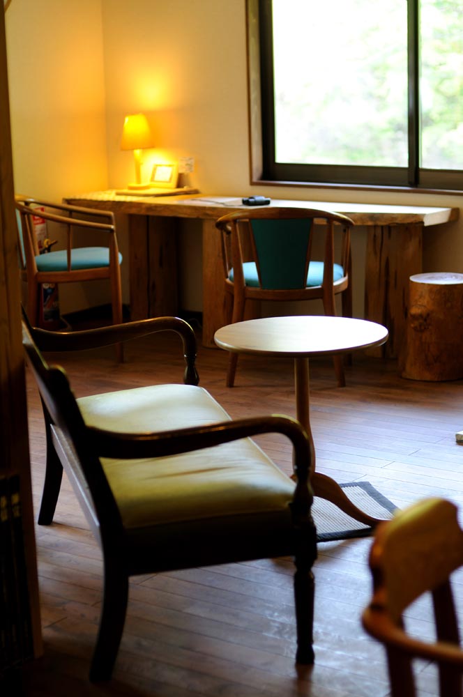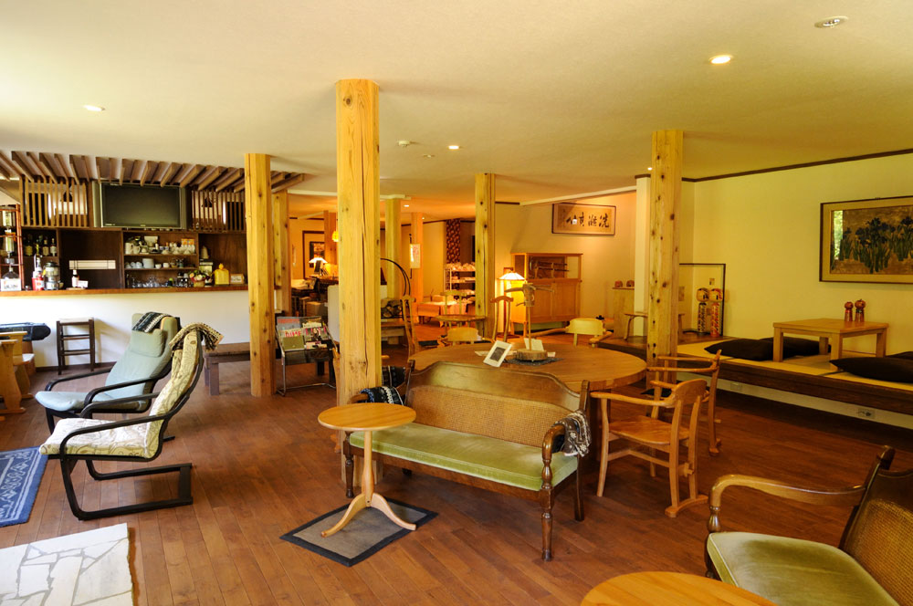 そこに現われる宿は「日本秘湯を守る会」の会員の宿。まさに秘湯の宿に違いない。ロケーションからすれば確実に、これ以上ないくらいに秘湯なわけですが、だが宿泊棟に到着してみると、なかなか瀟洒な建物に「おっ」と思う。なりふりかまわない宿でないことがよく分かる。それどころか、ロビーなどは趣味のいい椅子が点在し、カフェのようだ。さらに言うと静だ。宿泊の棟と日帰りの棟が分かれているので、静なのだ。ホスピタリティーの面では秘湯という言葉にとらわれない進化がある。それはスタッフの接客にも浸透しているようだ。ちなみに入り口を別にした湯治棟というのもあって、こちらは日帰り入浴も受け付けている昔ながらの秘湯の姿があります。日本三大胃腸泉に数えられる峩々温泉のお湯には、「のむ」「かける」「つかる」の3つの温泉利用がある。自分の仕事場にはこの湯18リットルを飲用に備えてありました。飲んでみると、体の水分とおんなじ成分なんじゃないか?と思うくらい、口当たりがマイルドで、喉をするすると流れ落ちていきます。また欲しいな。