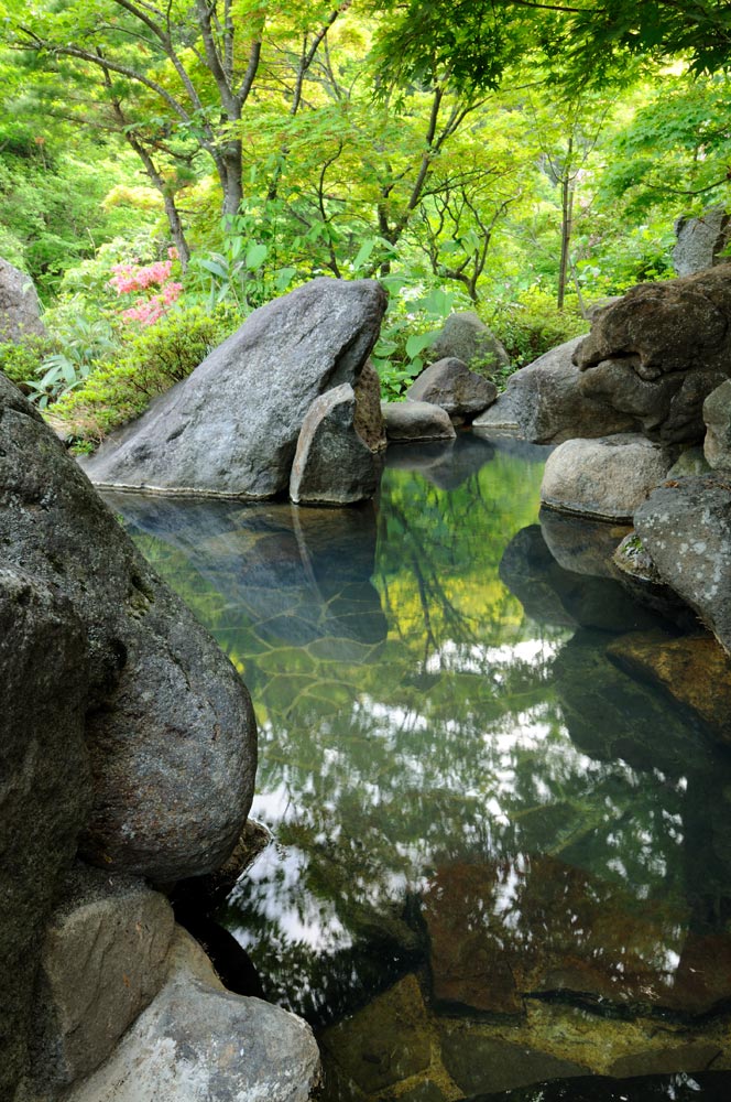 早速、川沿いにある混浴の露天風呂へ。運良く貸しきり状態でこの新緑で満たされた露天風呂を独占した。