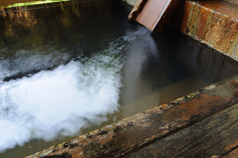 100回は繰り返すのが慣わしと聞き、そんな根気の要るごとを・・・と思うが、背中は温泉でポカポカと温かく、意識は朦朧・・・。手はやがて勝手に動き出し、100回は以外に早く到達している。これは「あつ湯」での話、写真がうまく撮れなかったので載せてないけど。大浴場には男女ともに浴槽が2つあり一方が入浴のための「ぬる湯」、そして小さめのほうがこの峩々の伝統的な入浴ほうほう「かけ湯」のための湯船だ。峩々温泉はもともとこの「かけ湯」するものだったらしい。