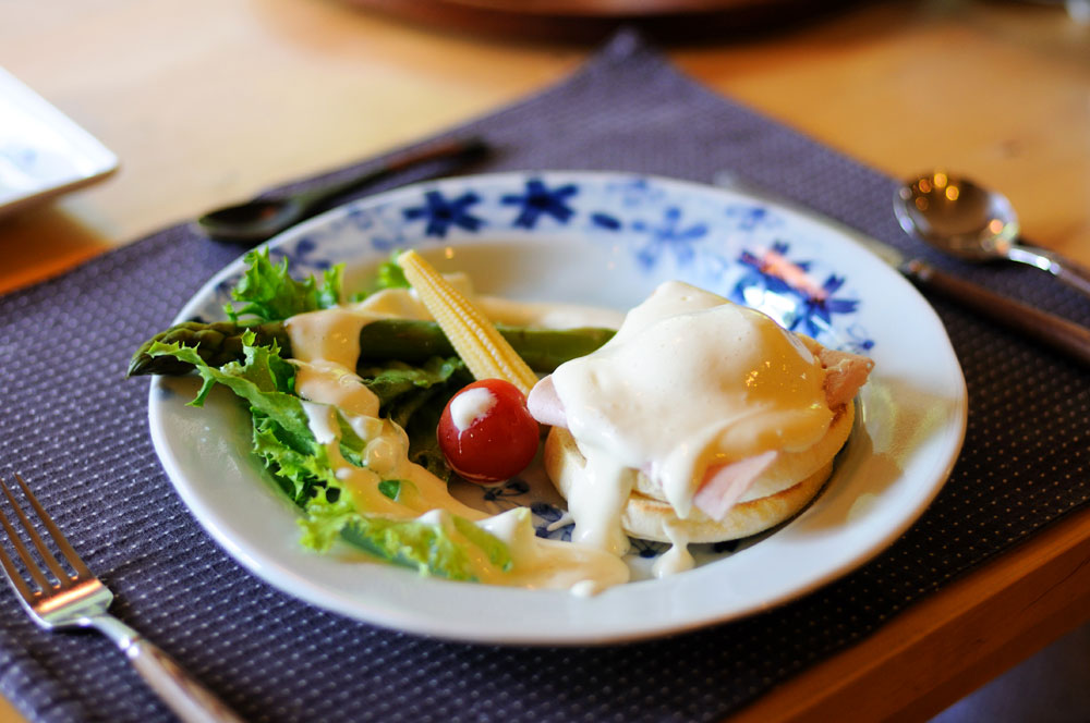 旅館には珍しく朝食は和食・洋食のどちらかを選べるのです。連れは和食、自分は洋皿。ハムを挟んだマフィンに、マスタードが隠し味のムースマヨネーズがかかってます。食後はラウンジでふるまわれる水出しコーヒー。