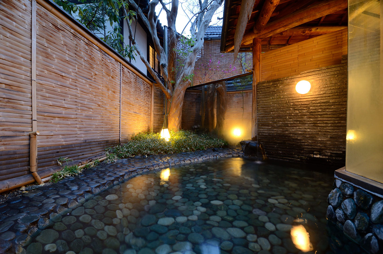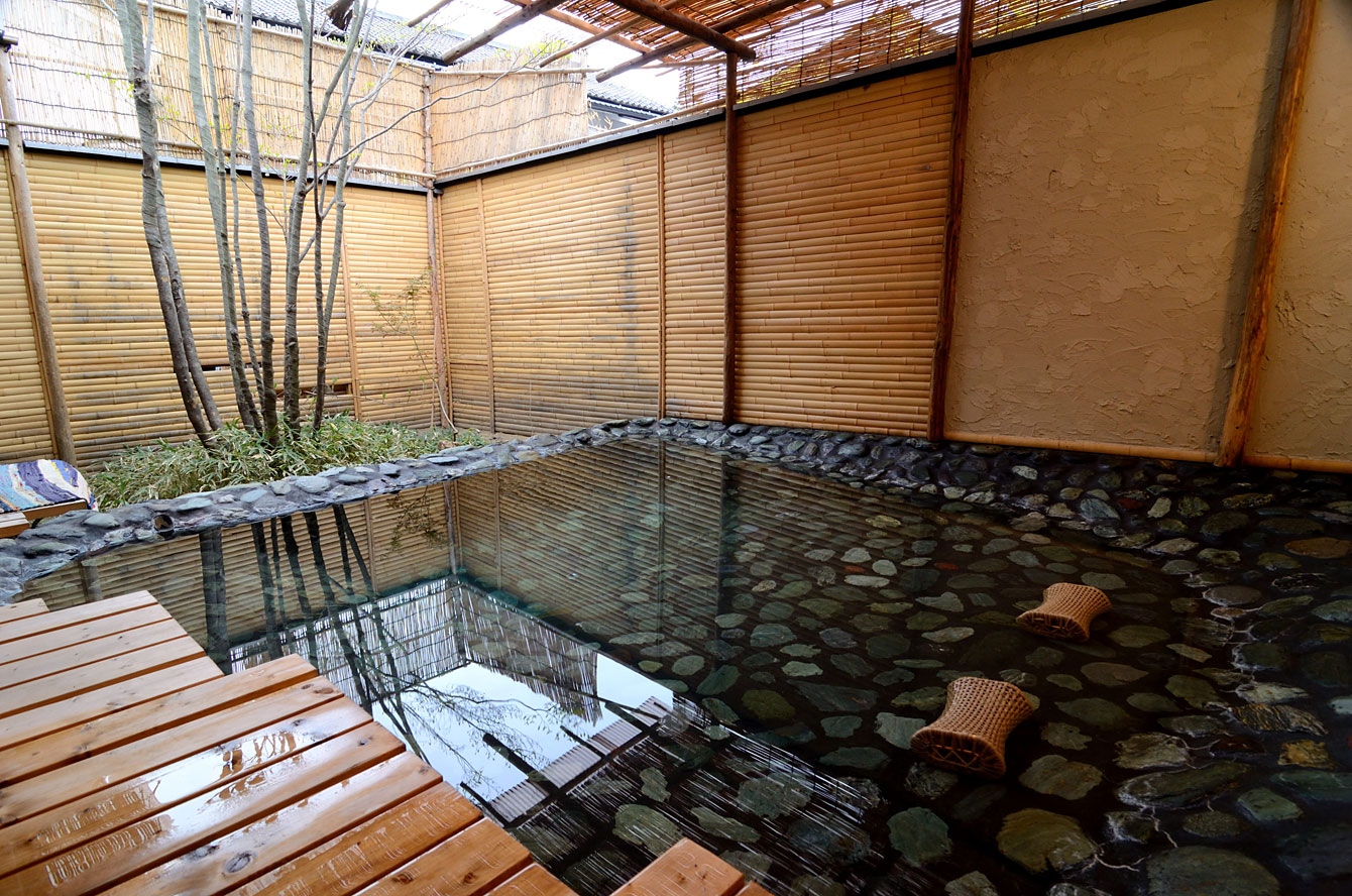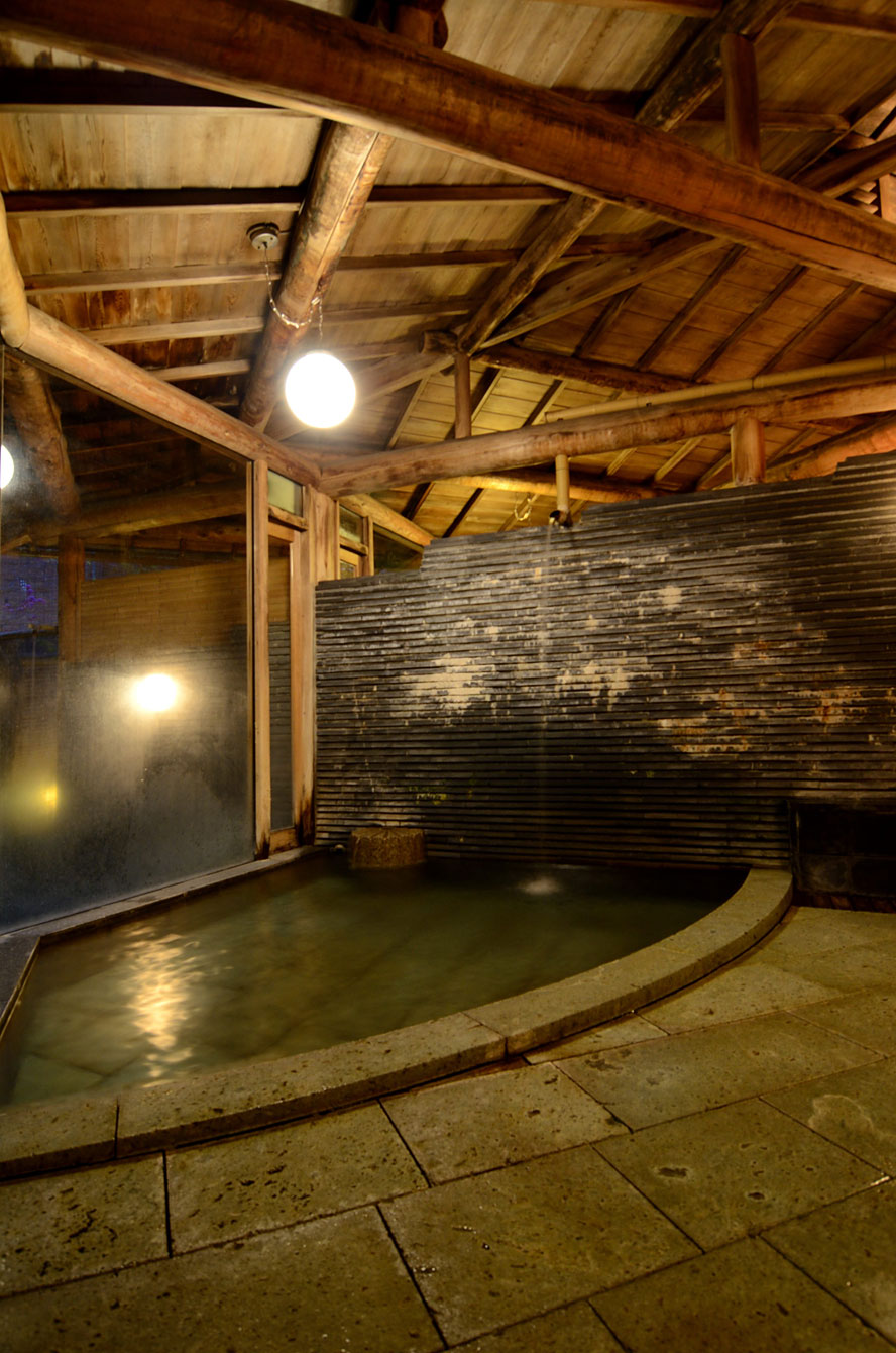 木曽五木の風呂。十和田石の湯船を満たすは、江戸時代には松本城主に、「御殿の湯」と愛された源泉。いまも中庭でこんこんと湧く。宿の前身は殿様の別 荘であったらしい。