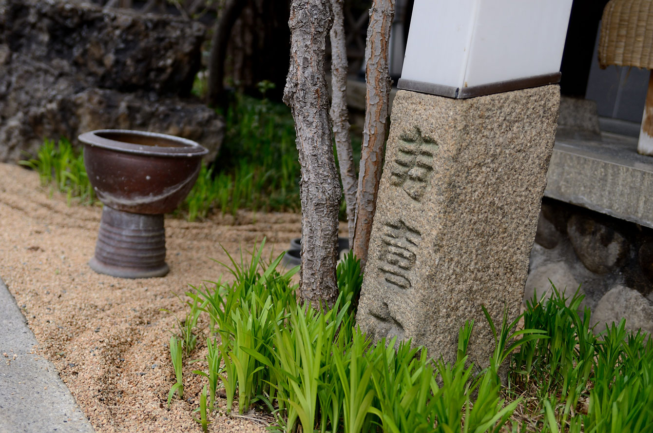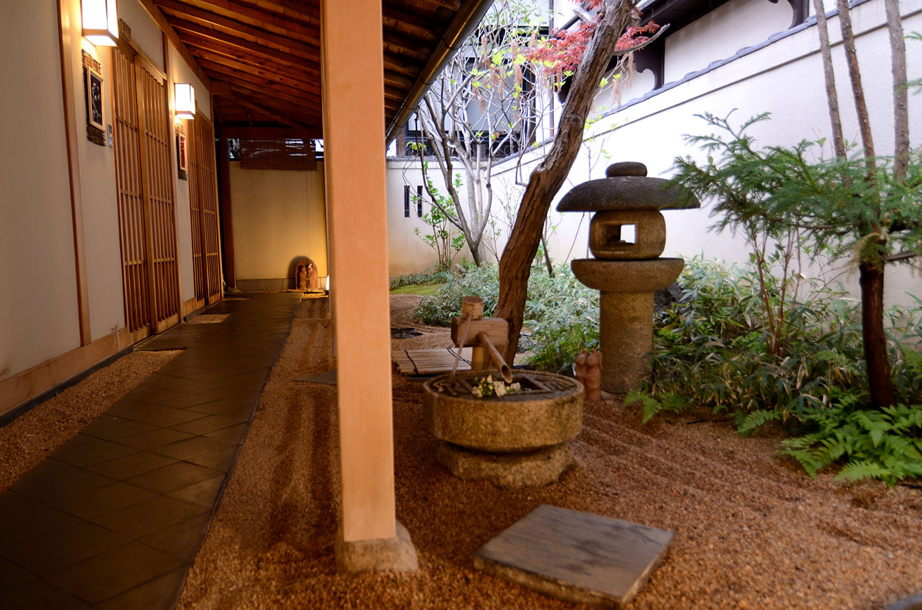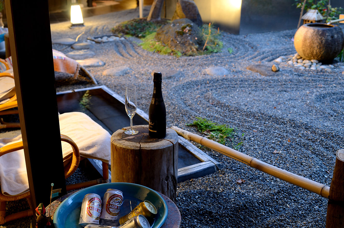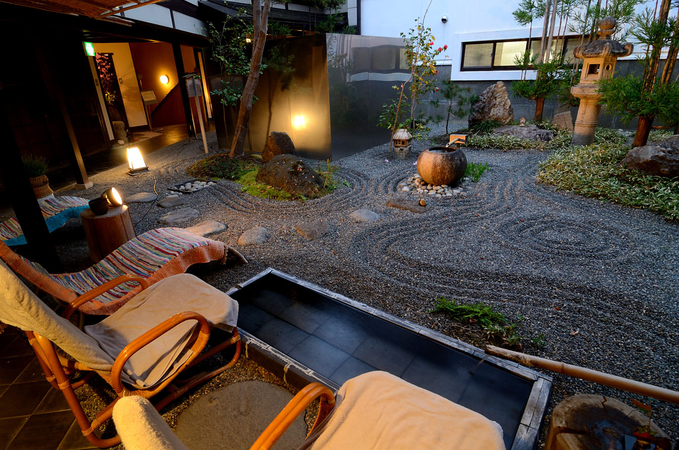 風呂を一通り入り終えて、食事までの時間をここで夕涼みすることにした。この枯山水、ご主人さんが泉を引くのだが、その様子を目撃した知人は「すごい気迫と形相」で声すらかけられなかったという。奥に見える銀色の囲いの中に、奈良時代から沸き続けてる源泉の「束間の湯」がある