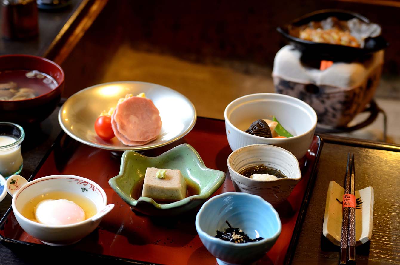 朝食も囲炉裏の食事処で。ゴマ豆腐、飛騨ならばこその明宝ハムは昔なつかしい味。
