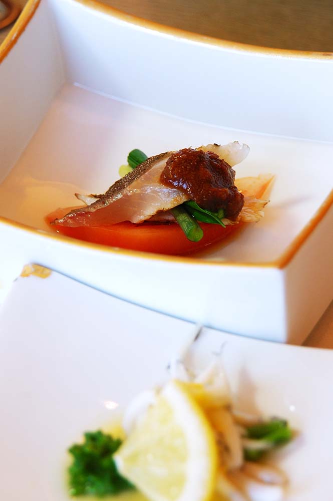 続いては軽くあぶった鯛に行者にんにくと赤味噌がのる。敷かれたフレッシュトマトと一緒に口にほおばるとまさに未体験の味が広がる。隠し味になにか入っているようだ。