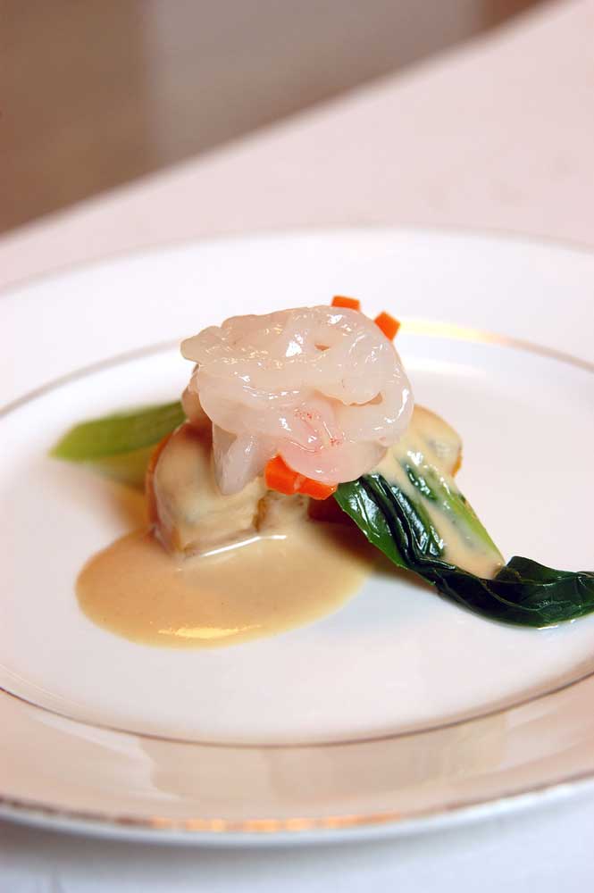 続いては目にも麗しいフレンチのような盛り付け。甘エビに株のスライスがのりハーブのドレッシングが効いている。次にどんな料理が登場するのか期待が盛り上がり、同行の連れ合いと、いつになく上機嫌で料理をいただいたような気がする。
