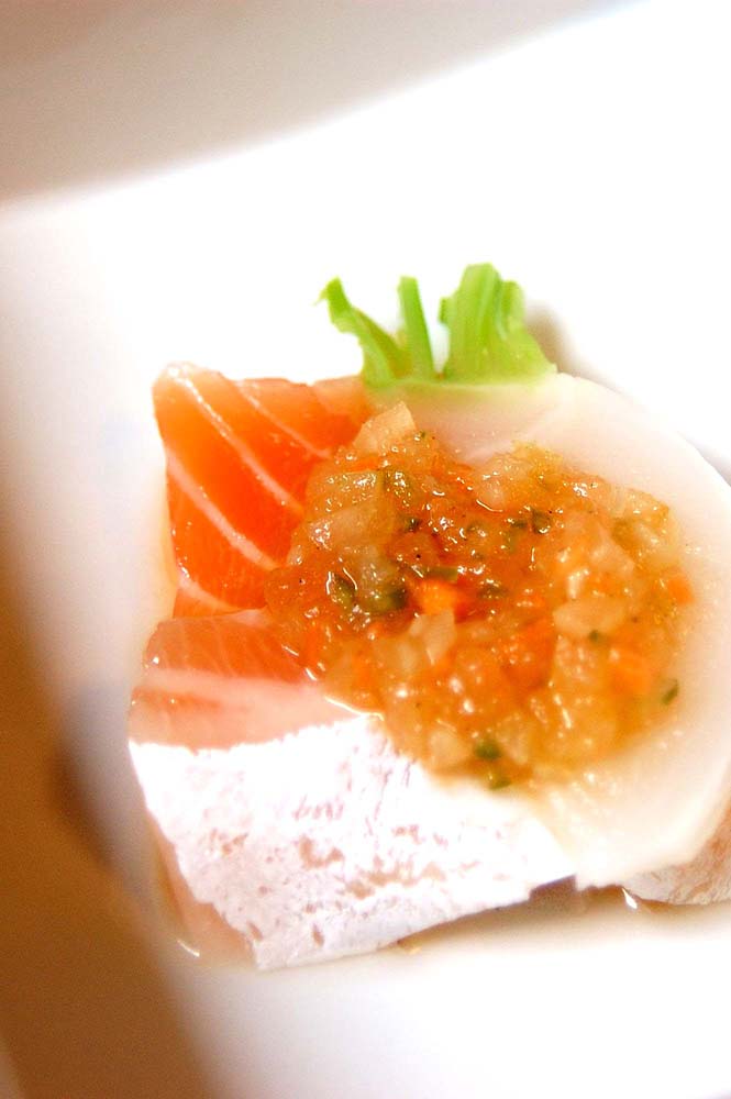 前菜サーモンのカルパッチョサトイモ田楽バイ貝いつも違うものを出してくれるのでとても楽しみな一品。和食にこだわらず創作料理を出してくれるのが魚恵のいいところなのだ。