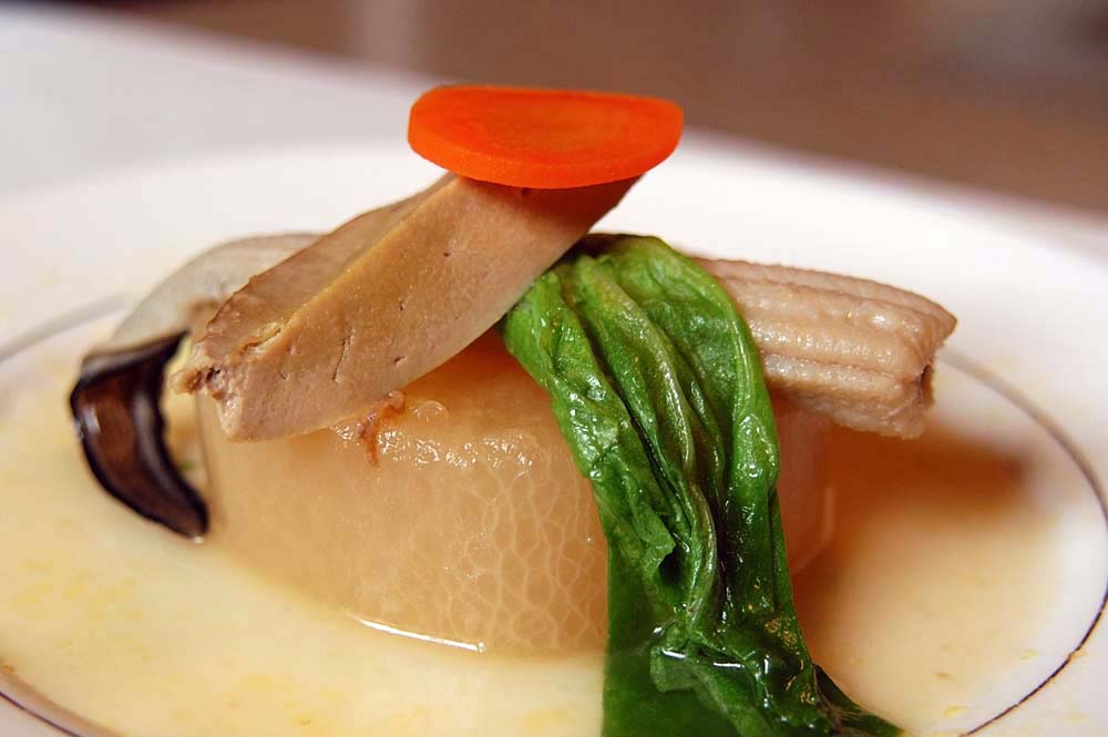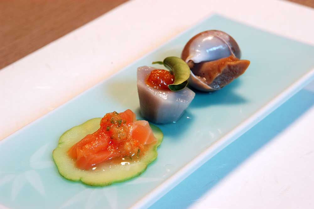 ぶり大根というのはぶりと大根を一緒に煮込んだ富山の冬の郷土料理。今回頂いたのはそれをベースにした創作ぶり大根。同じ出汁で煮たと思われるアン肝と穴子がのせられている。冷製なのに魚くささがなくぶりのうまみが凝縮されている。穴子もアン肝ももちろん大根も絶品だ。