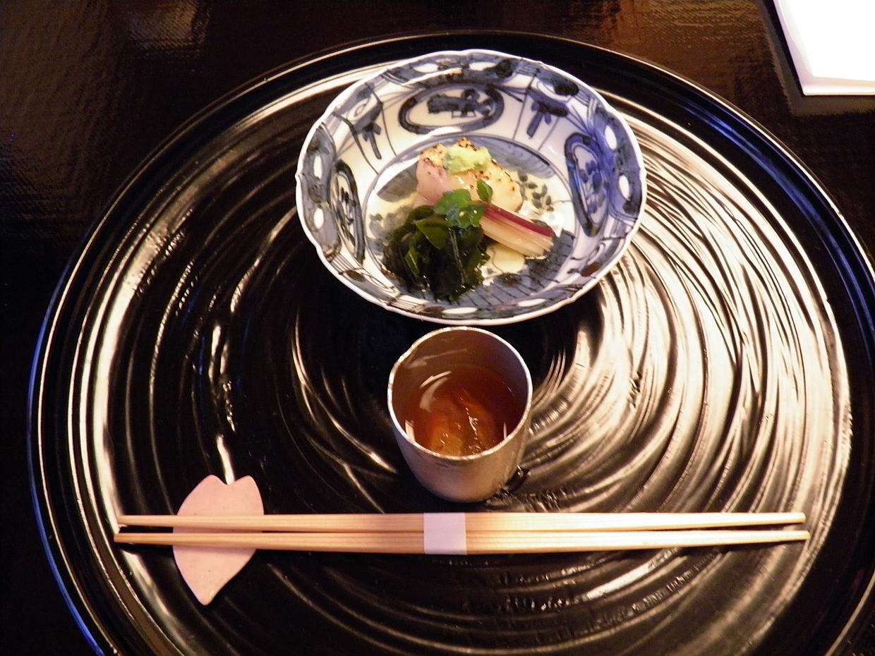 先付:平貝炙り・新若芽・浜防風酢ゼリー掛け・山葵