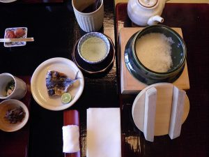 左:炊きたての茨木産ミルキークイーン *鯵干物は骨が全て外してあります
