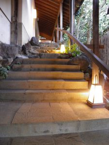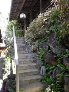 一服したあとは、二つの階段と休み処のある通路を通って風呂に向かいます。