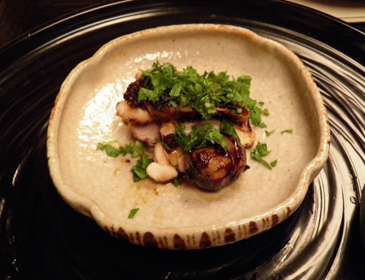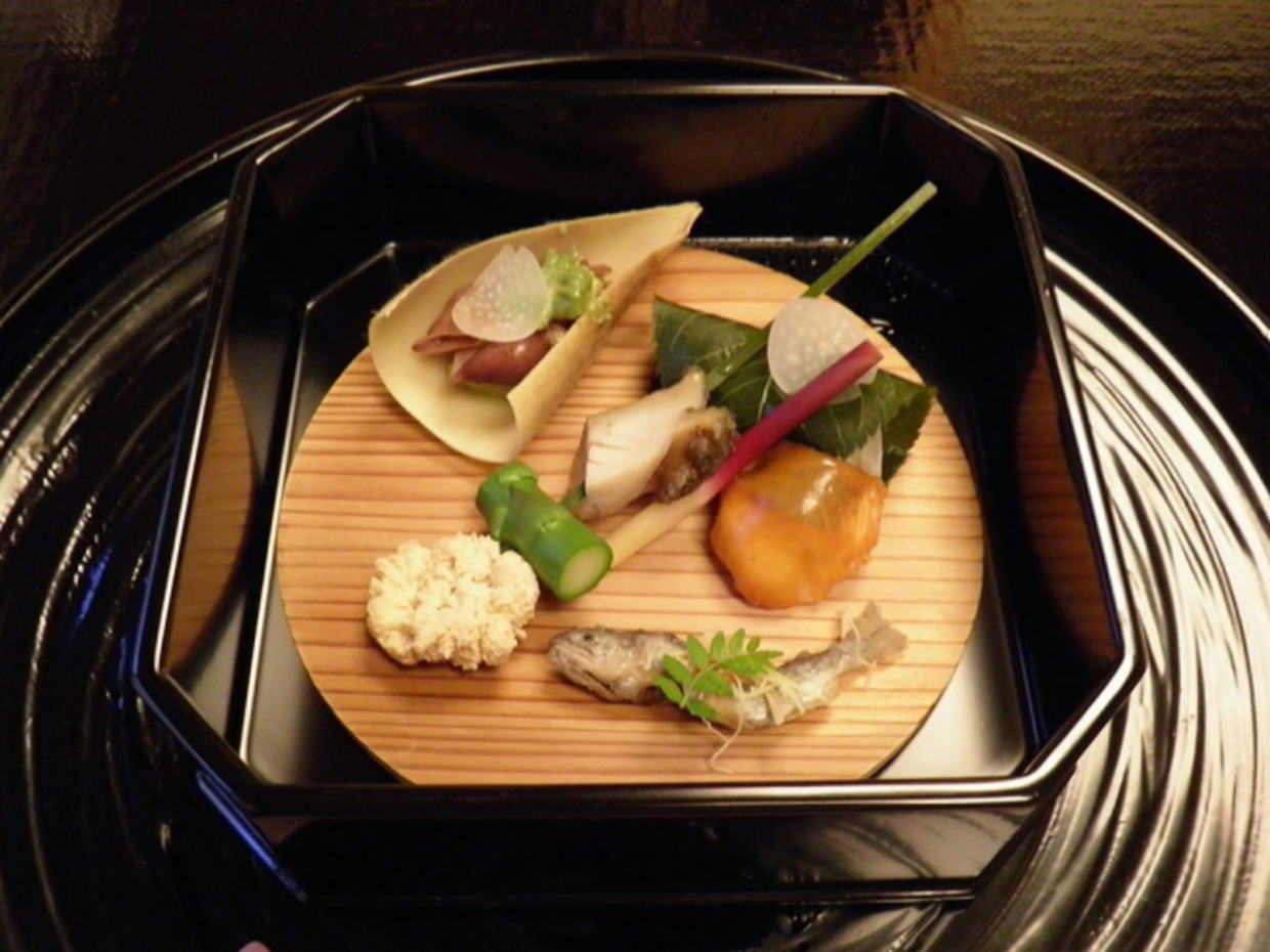 八寸:筍・蛍烏賊木の芽和え・はじかみ・桜寿し・花弁独活・蒸し鮑・鯛子旨煮・アスパラガス・千鮎南蛮漬け・桜鱒辛子焼き