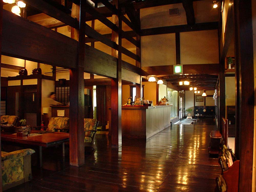 磨きこまれた床を素足でぺたり歩く、約150年前の新潟の庄屋を移築したロビー。ぴっかぴかに磨きこまれた床板は黒光りを放ち、見上げると煙に燻された塗 壁と無骨な梁や桁が行き交い、妖しい陰影が生まれる。チェックインの頃にはジャズが囁きはじめた。