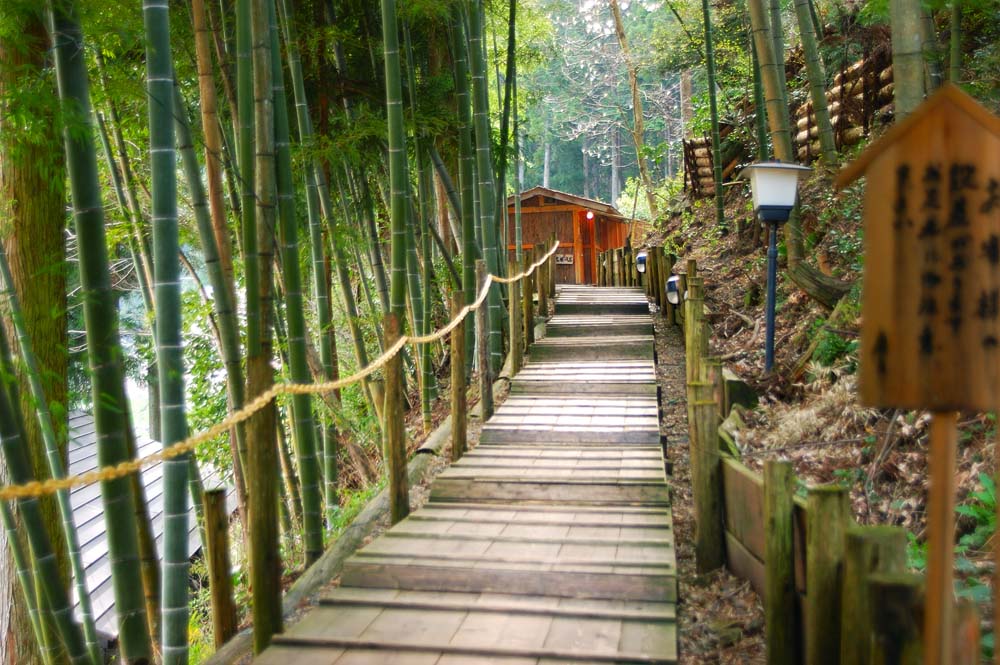 通路を通って少し高台へ行くと山小屋風の貸切風呂と、家族風呂。風呂あがり、そよ風に吹かれながら歩く竹林の通路は言い表せない心地よさ。悦楽の域。