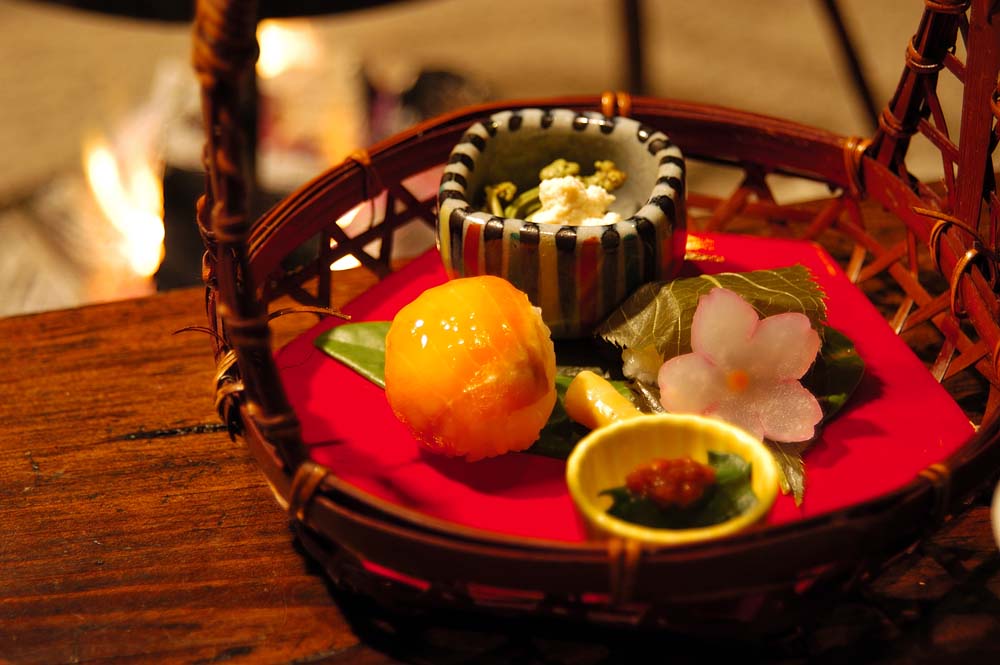 食事どころは個室になっていて、囲炉裏では既に岩魚が串焼きされている。ここで頂くのは飛騨の山の素材をつかった懐石料理。手持ちのついた籠風の器に 前菜が運ばれてきた。鱒の手毬寿のなんとかわいらしいこと。