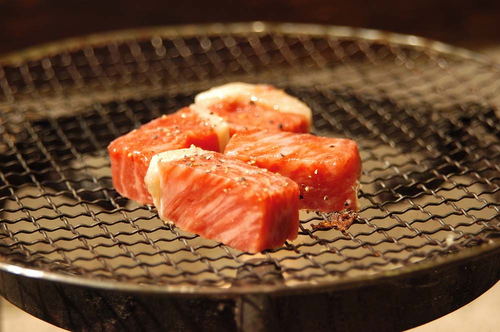飛騨牛ステーキは塩、コショウで味付けされていて、軽くあぶるだけでうまい。本当に旨い肉ならこの食べ方が一番ではないだろうか。まわりはパリッと 炙ってあって中はミデアムレア。やわらかくてジューシー。デザートはりんごのムース。