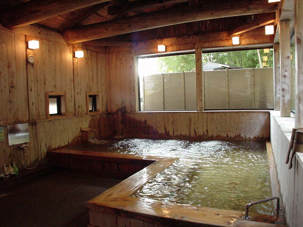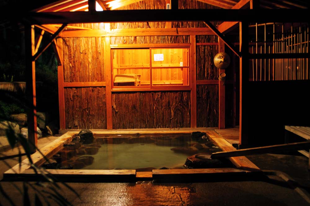 近くの山中に自生していたという樹齢400年を超える高野槙の古木で組上げた湯船はすごい風格。かすかなイオウの香りが鼻腔をくすぐる。連れはそのぬ るいほうで顔を洗ったらしく「洗っている間から肌が面白いことになる」とご満悦。(写真は男女別の内湯