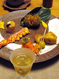 料理は選択自由だが、宿の自慢でもあるのでぜひ味わってみることをお勧めする。日替わりの夕食は月変わりの創作懐石料理。料理長の研究熱心さが伝わってくる。