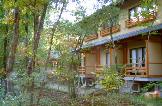 その日はあいにくの空模様、楽しみにしていた北アルプスの姿も厚い雲に阻まれて見ることが出来なかった。傘を忘れ、びしょぬれでたどり着いた宿、雨で冷え た体を温泉で暖めると、五感が蘇っていくようだった。 木々の香りを吸いながら、ずいぶん長いこと露天に入っていた。 交通手段のない昔の人たちは、きっと大変な思いで旅路を過ごしたのだろうな、宿に着いた時は、きっと救われたような思いがしたに違いないなどと想像しなが ら。……旅から戻り、いつもの生活に戻っても、気がつくと安曇野のことを考えていた。 翌月、私はまたあずさに乗っていた。ときめくような思いで。今日こそ、常念岳は横通岳は、その姿を見せてくれるのだろうか。宿は前と変わりなく、そこに在 り、私を迎えてくれるだろうか。私はおかしい。どうかしてしまったようだ。この思いは何だろう。 旅行好きのオーナーが安曇野という土地にめぐり逢って開業したという「なごみ野」。 旅人に何が必要なのか知り抜いている人が建てた宿だと思う。華美なインテリアも凄い設備もない。その代わり、自然との融合を第一に設計された宿。ラウン ジ、食事処、部屋、風呂、どこからでも自然の木立を眺めることが出来る。そこに居るだけで癒され、その空気の中にずっと居られたらと思う。 安曇野を愛するオーナーと建築家が創り上げた理想郷は、安曇野に恋した旅人にとっては特別な場所となる。心に響く何かがあるとすれば、そこに共鳴するもの を感じたからなのだろう。