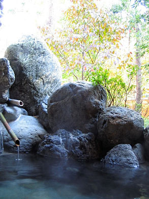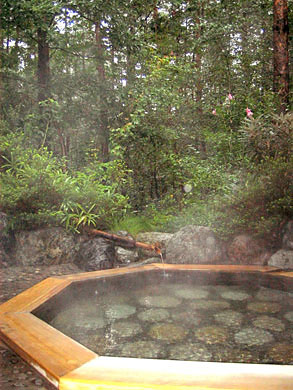 温泉は穂高温泉よりの引湯。大きな窓のある内湯。露天風呂は内湯と別の場所にある。森林浴と湯浴みが同時に楽しめる。写真左は女湯の露天風呂。岩を配した無料の貸切露天風呂(写真右)もある。