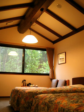 女性好みの洋室、落ち着ける和室、15部屋ある客室はすべて違う造りになっている。客室に入ると、まず天井の太い梁に目を奪われる