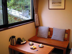 朝夕の食事は2004年4月オープンの食事処で。茶室風の食事処は秘密の小部屋のような雰囲気。やはり中庭を眺めながら食事が楽しめる。朝食後には無料の珈琲サービスがある。