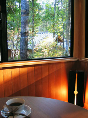 全ての部屋から中庭の木々が眺められる。窓辺のコーナーにも木の家具。、図書コーナーで本を借りて読書しようか、鳥と風の唄に耳をすましてぼーっとするひと時もいい。