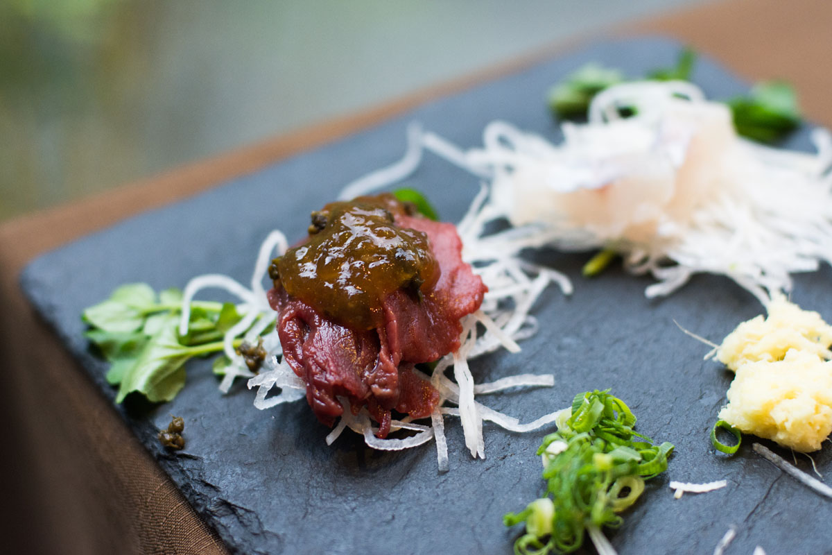 馬肉はしその実と醤油ジュレで。