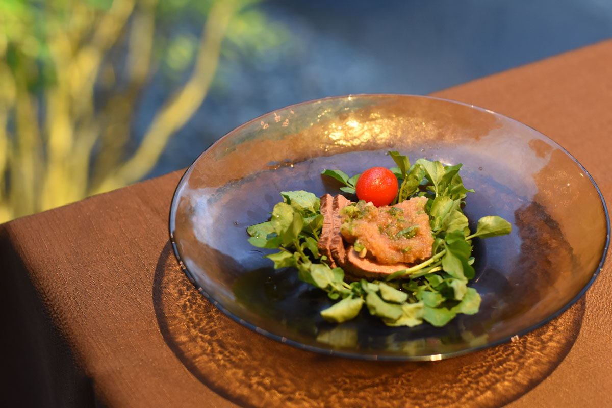 ワイン用のブドウの搾りかすで育てたという甲州ワインビーフのローストビーフ 。