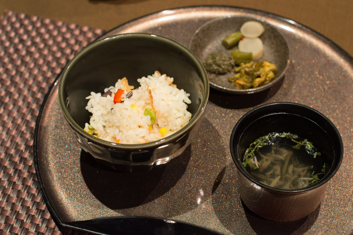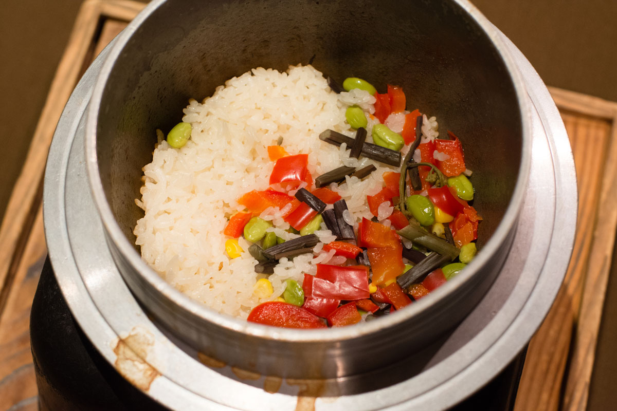 夏野菜の釜めしは、岩魚の出汁が効いてるんです