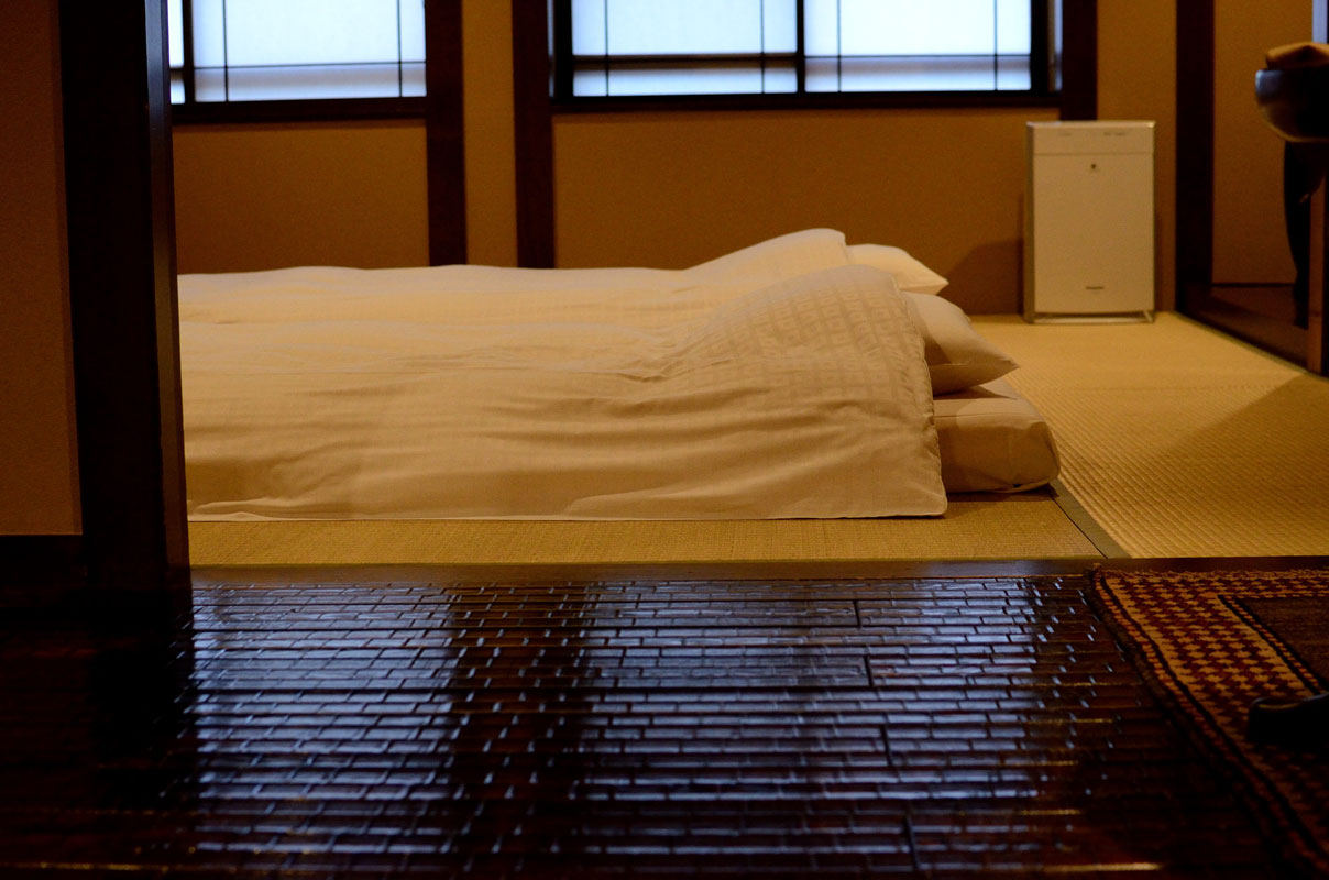 部屋へ案内してもらう途中で館内の説明を聞いていると、通りかかったスタッフが僕らに気づきスッと立ち止まってお辞儀してくれた。そのスマートな立ち振る舞いに、いいお宿に来れたんだなという満足感が満ちて来る。とりわけ僕らはそういうことには敏感なわけではないけど、機械が自動でミス無くいろんなことをやってくれる時代、こんなことがちょっとした感動を生む。