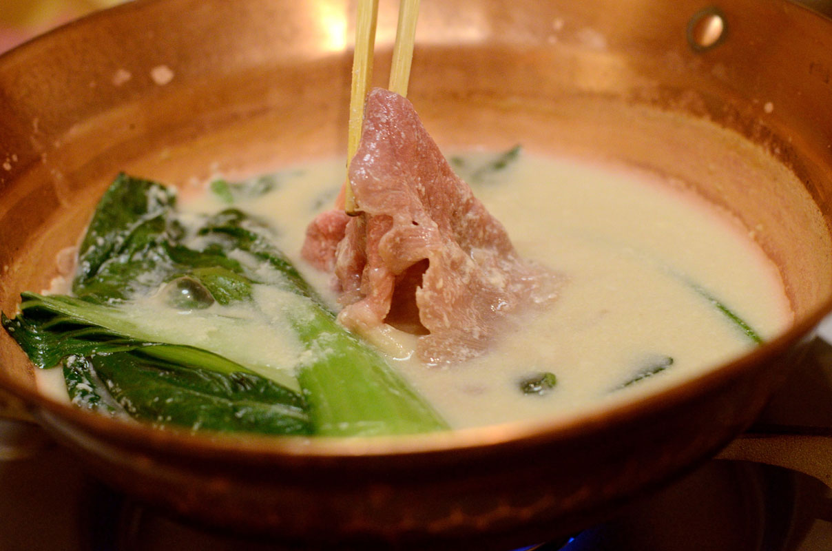 豆乳の出汁に野菜を投入してから、まずは三元豚をしゃぶしゃぶ