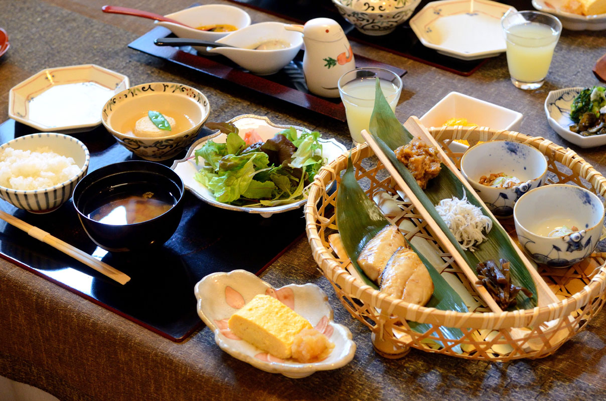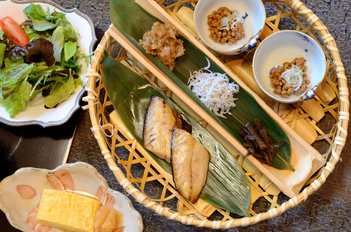 朝食はこたろうファーム直送の野菜達。ドレッシングは人参と玉葱の2種。こしださんが40年継ぎ足してきた鯖の干物。商品名はなんと「ものすごい鯖」という。日光の湯葉、那須産100%のりんごジュース。ちょいから牛蒡。きゃらぶき、そしてシラスは経験したことない美味しさ。
