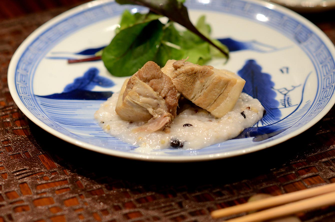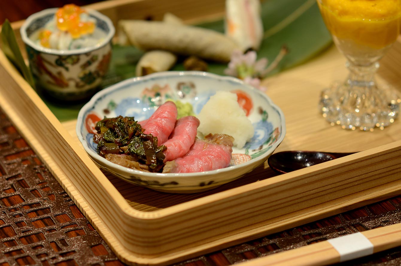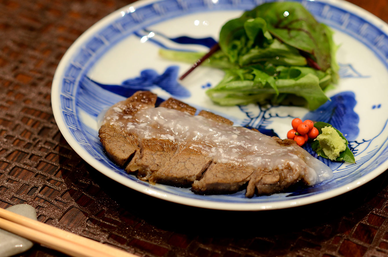 連れはこちらをチョイスして半分づついただいた。フィレのような部位なのでしょうか脂っこさがなく、代わりに肉の味の豊かなこと。舌の上でさらっと溶けていく。寄り添うような塩麹もgood。器は北前船が日本海を航海していたころの伊万里なのだそうだ。