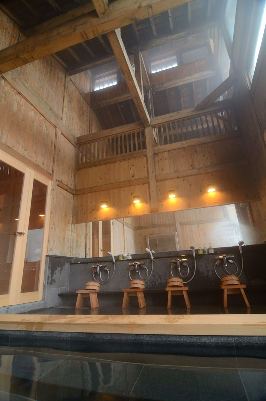 木の風格ある内湯。高い天井に湯気が抜けていくのを見ていた。