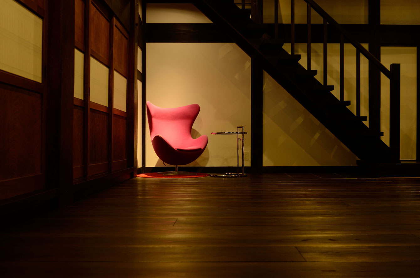 すっぴんの木肌の階段を素足で歩くとき、ベッドに滑り込んだとき、廊下に出たときに香っているアロマに知らずに気分がよくなってたとき、無骨な張の行き交う古民家にビビッドな赤い椅子という大胆なデザインにインスパイアされたとき・・・覚醒してくる視覚、触覚、嗅覚。