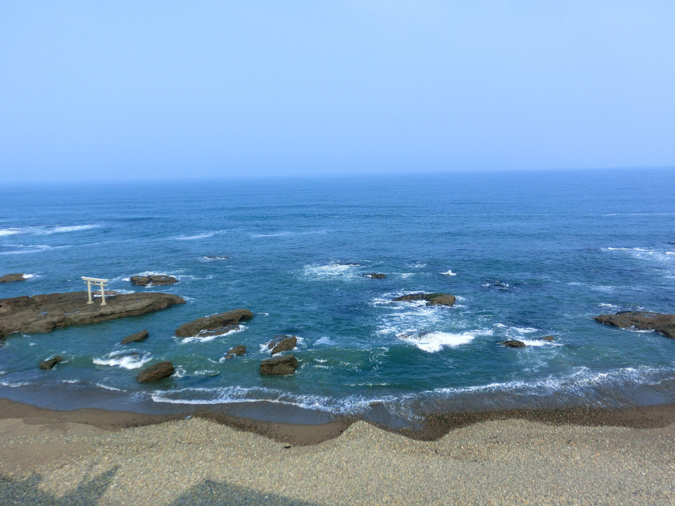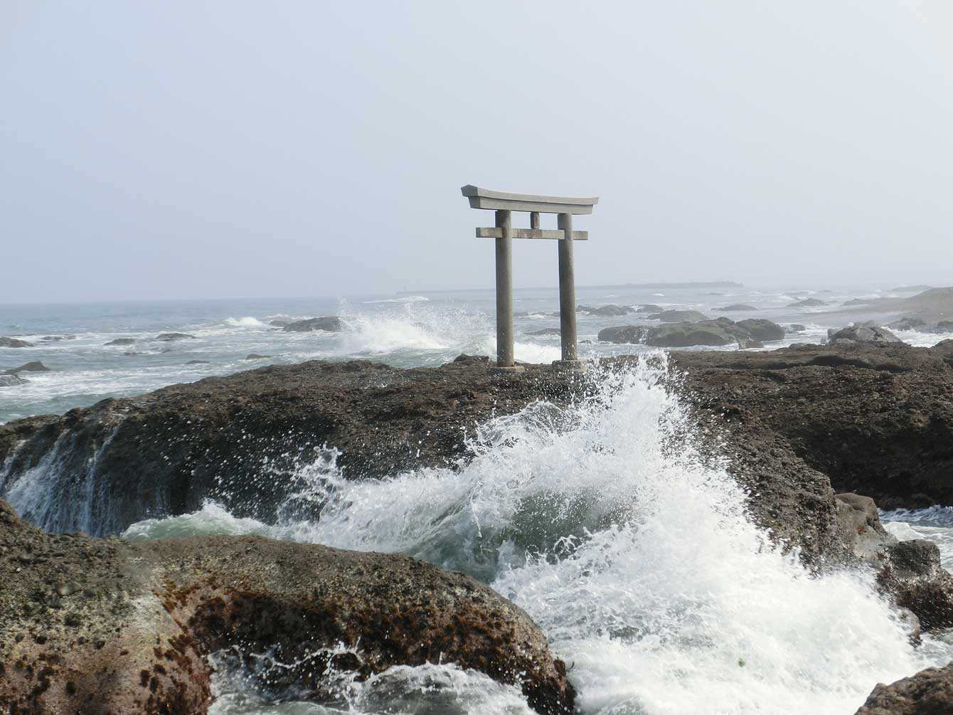 「水戸を離れて 東に三里 浪の花散る 大洗」と唄われた景勝地に里海邸はあります。この鳥居の場所は、かつて大洗磯前神社の神が降り立った場所と言い伝えられています。