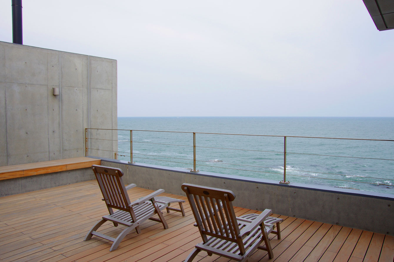 遮るものない最上階の絶景ラウンジでは、デッキチェアーに寝そべって、潮風を感じながら湯上がりのビール片手に海を眺めたりするのにうってつけです。また、朝、茨城の美味しい牛乳をそこで飲むのもgoodです。