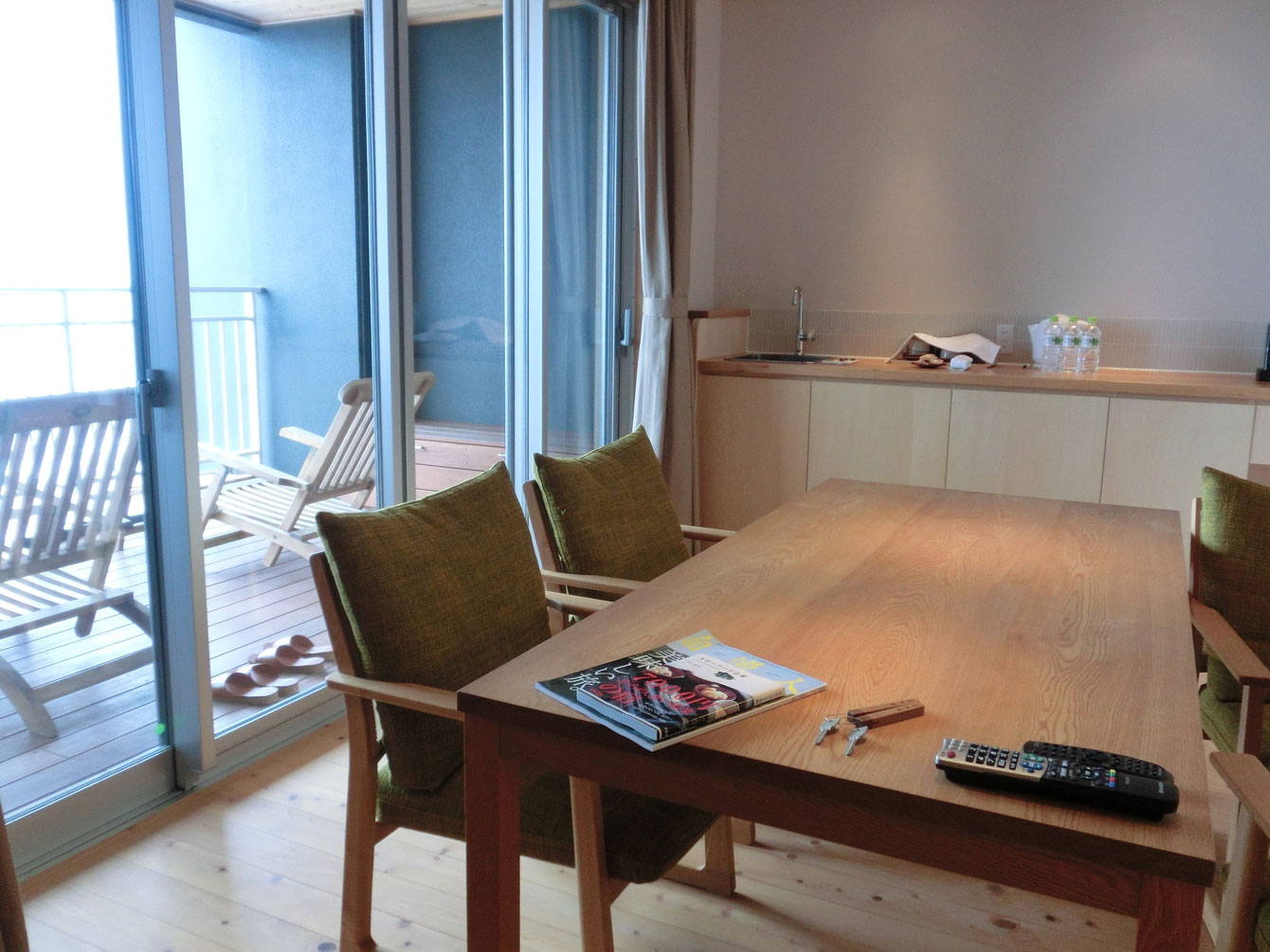 浴槽は石ですが、木をふんだんに使っているので、心地よい木の香りがします。窓の外にはウッドデッキも付いているので、波の音と潮風に身を委ねることもできます。(最上階で目の前は海があるだけなので、プライバシーは大丈夫です。)