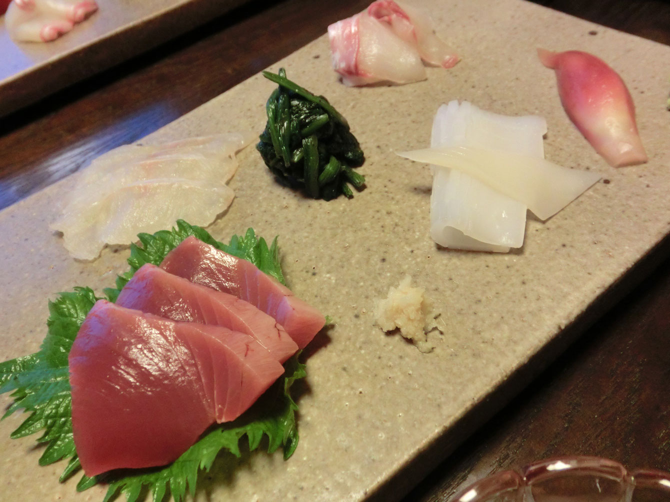 大皿に個性的に盛り付けられた旬のお刺身。透き通る白さと鰹のピンク色がかった赤が印象的。もちろん、鮮度抜群、刺し身の甘みがたまらないです。