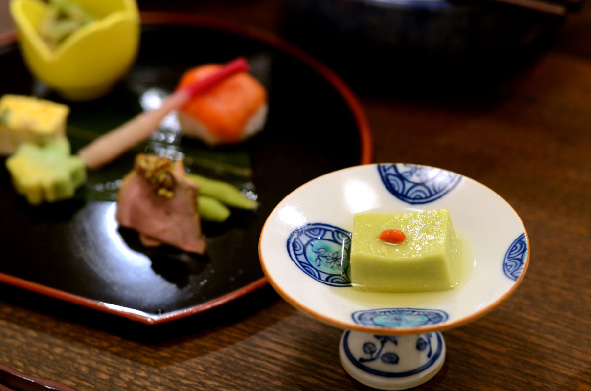 空豆豆富。まずこの色彩にほっとこころ和み、空豆の風味とやさしい味わいが胃袋をやさしく整える。
