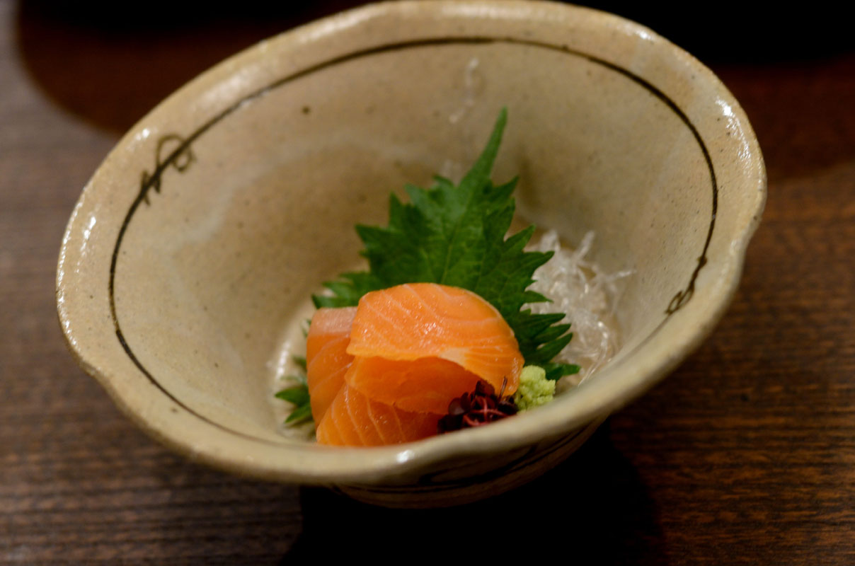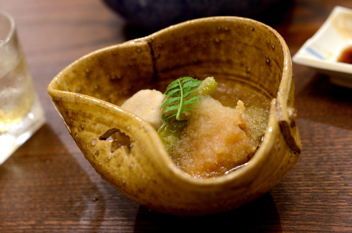 取り回し鉢は3皿。ごぼうの煮物、ふき、そしてアスパラだ。ごぼうはけっこう太いのにやわらかく、しかもごぼう独特のえぐみがぜんんぜんない、上品な味だ。これに気をよくして、やっぱりごはんお代わりしてた。