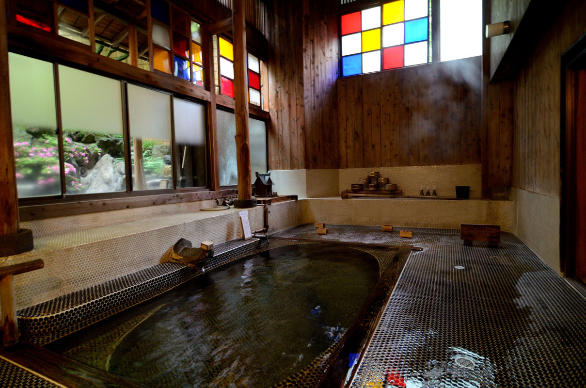 高い天井のステンドグラスから神々しい光が差し込み、レトロなタイルの浴槽を染める。湯は熱めだが、外湯みたいに暴力的な熱さではなく、野沢に来て初めてゆっくり湯船に浸かることができた。もちろん源泉掛け流しで、源泉は90℃あるが、それを風で冷まして適温にしているらしい。