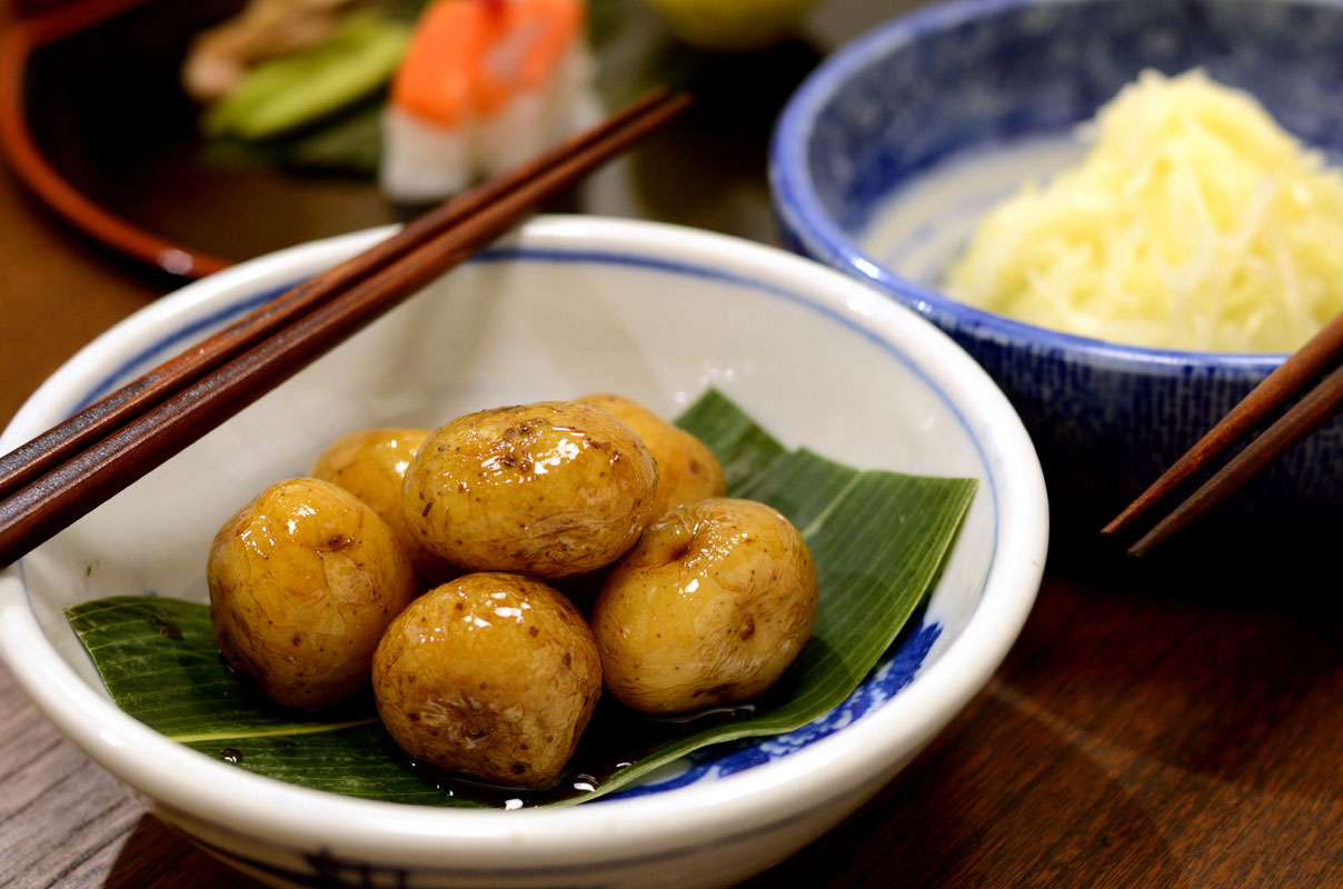 名物は「取り回し鉢」といって、皿に盛られた郷土料理を取り分けてたべるのだ。夕食にはその取り回し鉢が2皿。「しおにいも」、「じゃないものなます」。しおにいもは小さなジャガイモを甘しょっぱく煮たもので、とても旨い。奥飛騨の「ひだ路」でたべた”ころいも”を思いだした。