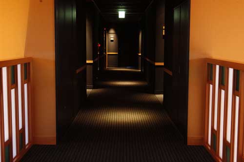 部屋へ向かう通路は闇と見まがうほどに暗い。視界を奪われ驚いていると、廊下に漂うアロマオイルの香りが心に安息をもたらした。