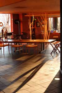 「外の景色と一体化している」。吹き抜けのロビーに立った時、直感的にそう感じました。愛知県の三州いぶし瓦を床に用い、「ハンノキ」や「ヤナギ」の自然木で十勝の風景を再現しているそうです。