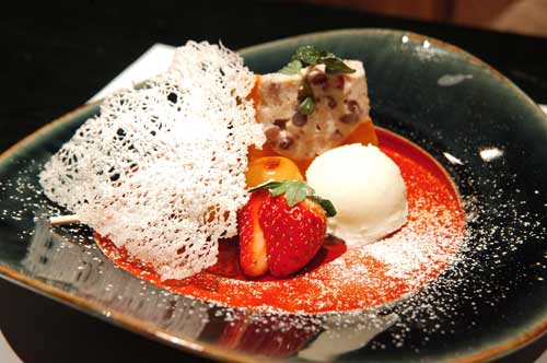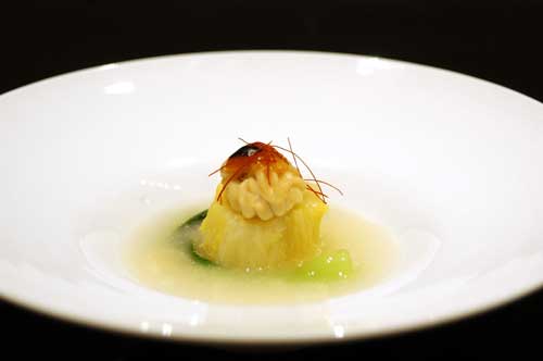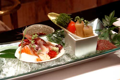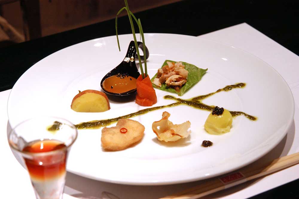 料理も工夫されています。北海道は食材の宝庫。畑のものから海のものまで、 食材の力だけでもある程度お客を納得させられるものが揃う土地です。 その食材の持ち味を十分生かしながら、ちょっとした驚きとともに一つ質の高い料理にしてくれます。 食事処から見えるところにあるオープンキッチンからは料理人の動作、声、料理の匂いがダイレクトに伝わり、 ライブ感あるディナーが始まる。 その料理はフレンチのようなきれいな盛り付けもあるが、食べてみると出汁の香りが漂う和の料理であることに気づく。 さらに食材についても産地指定やで仕入れるこだわりをみせる。 メインディッシュには十勝牛とタラバガニを炭火焼に。 5種類のオリジナルソースで頂く。これをどのソースにつけたら旨いか・・・なんて想像しながらが楽しい。