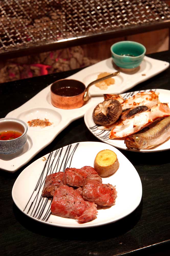 十勝牛とタラバガニを炭火焼は5種類のオリジナルシースで頂く。ワインとポン酢のソース自家製香味醤油、オープン以来継ぎ足しして使うごぼうとバルサミコのソースなど、食材の色々な持ち味を引き出す
